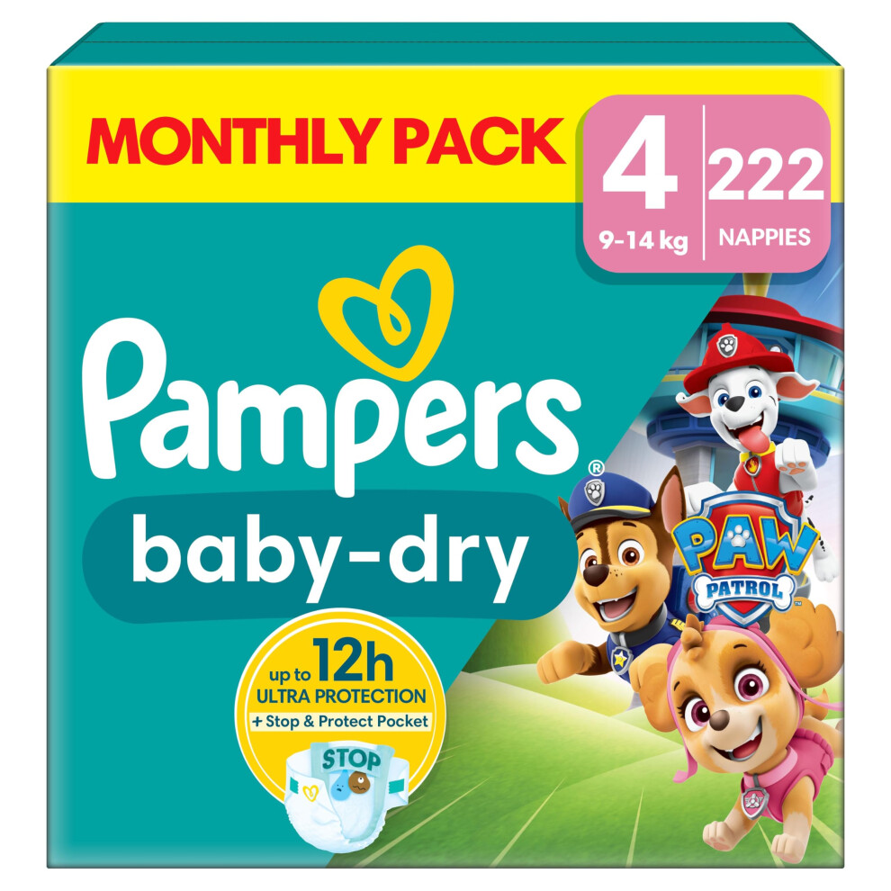 Pampers Baby-Dry Paw Patrol Edition Size 4, 222 Nappies, 9kg - 14kg, Monthly Pack, with A Stop & Protect Pocket to Help Prevent Leaks at The Back