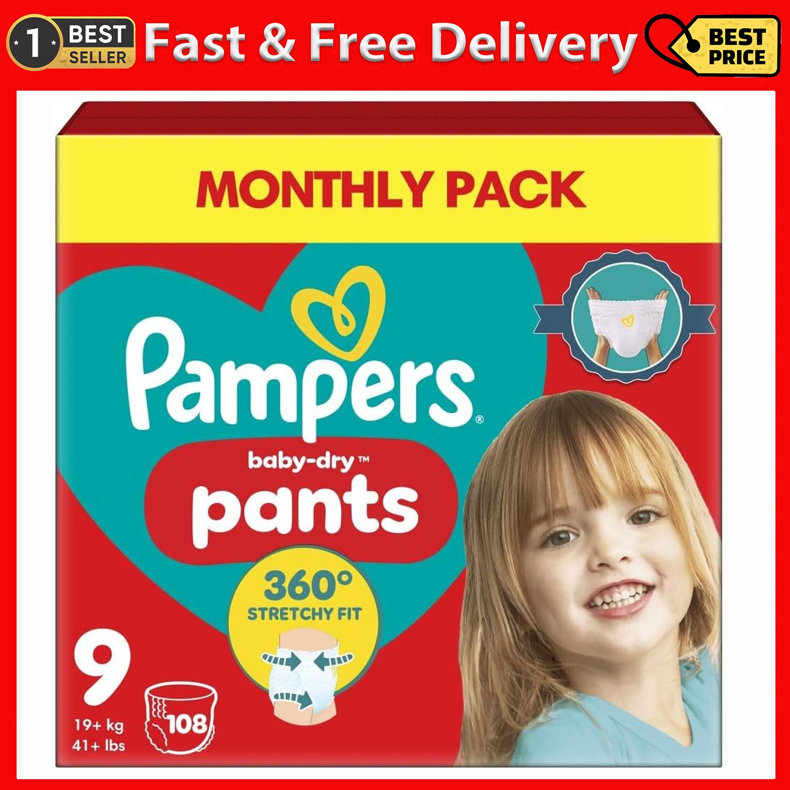 Pampers Baby-Dry Nappy Pants Size 9, 108 Nappies, 19kg+, Monthly Pack, 360 Fit to Help Prevent Gaps and Leaks