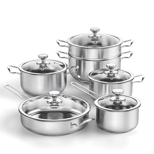Stainless Steel Cookware Set, Wodillo 11-Piece Pots and Pans Sets with Lids, Induction Hob Pan Set for Healthy Cooking, Stay-Cool Handles, Easy to Clean, Suitable for All Stovetops