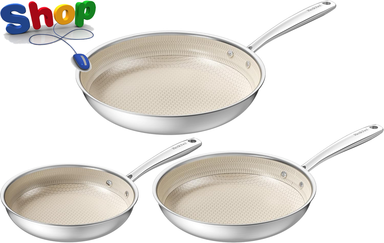 Redchef Ceramic Frying pan Set Nonstick, Hybrid Tri-Ply Stainless Steel Ceramic Pan,Non Toxic,PTFE/PFAS/PFOA Free,Dishwasher/Oven Safe (Beige)