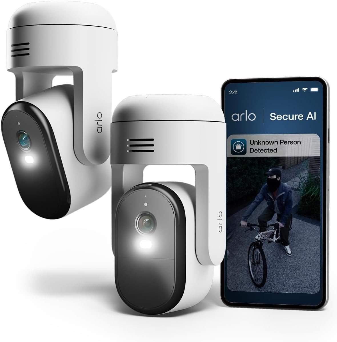 Arlo Essential 3 HD 360º Pan-Tilt-Zoom Video Security Camera Outdoor, Wired Home Camera With Colour Night Vision, Spotlight, Siren, 2 Way Audio, Arlo Secure Trial Included, 2 Cameras, White