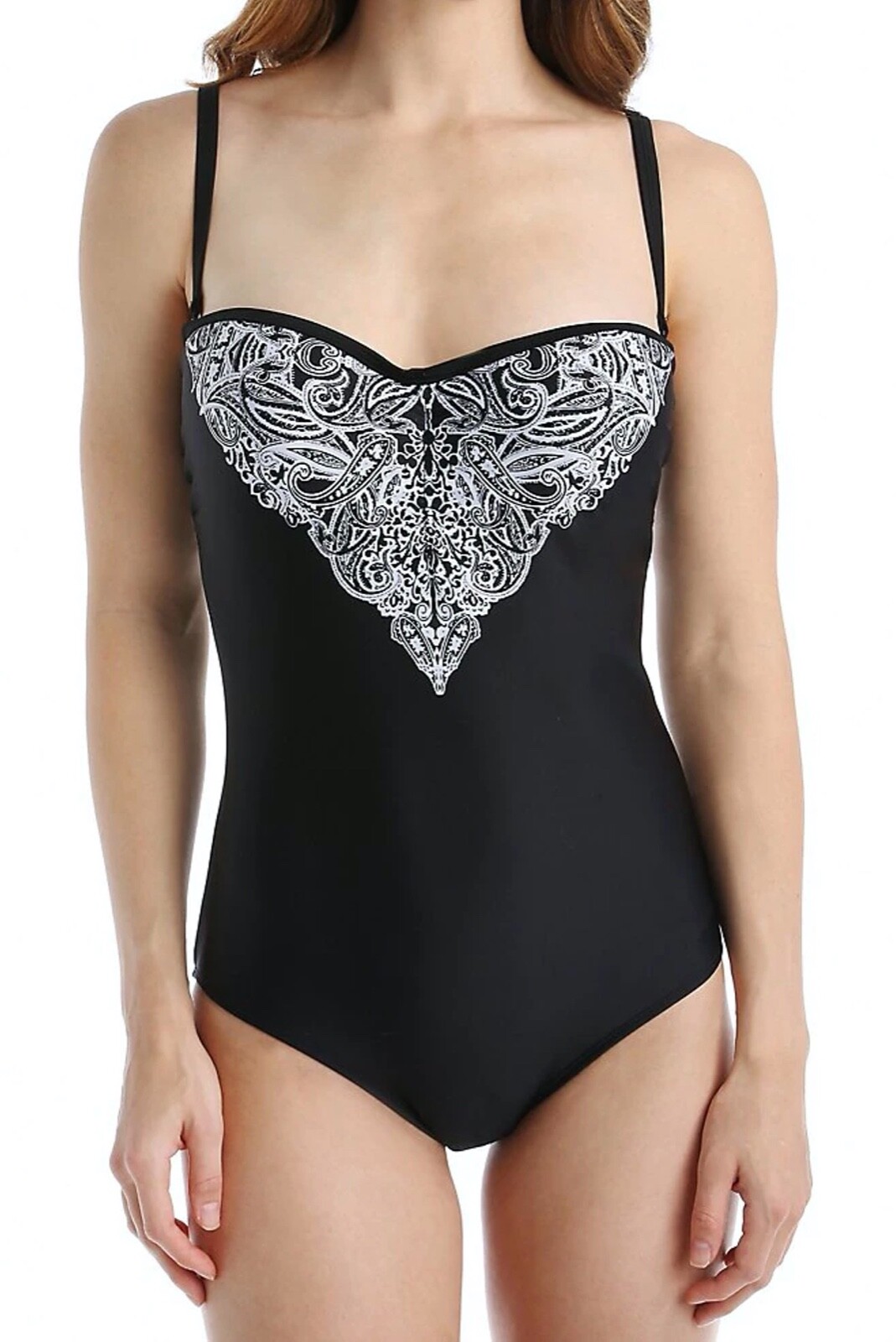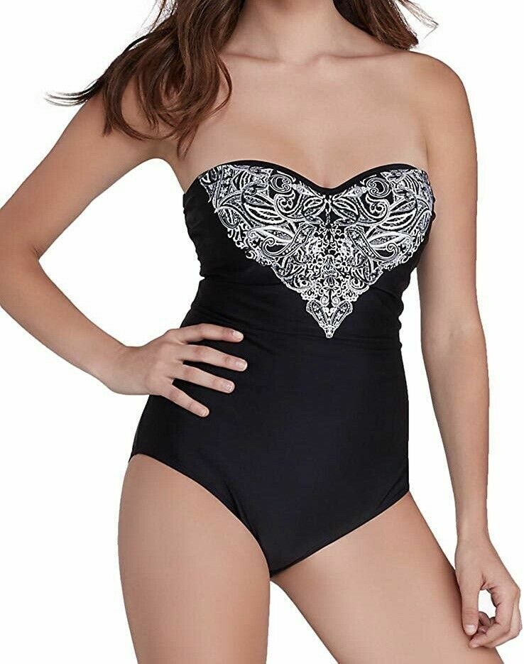Panache Santorini Swimsuit Size 32D 10 Black White Padded Strapless Bandeau Bra