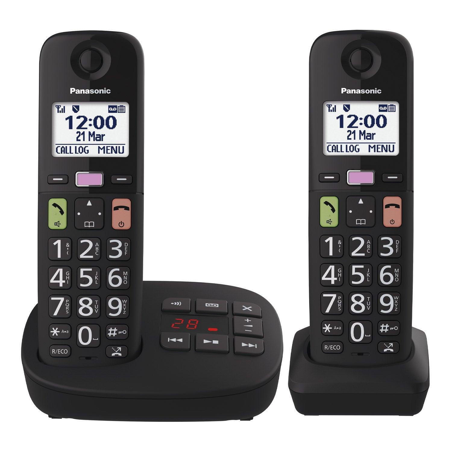 Panasonic KX-TGU132EB Digital Cordless Phone with Answering Machine, Base Unit & 2 Handsets, LCD Display, Big Buttons, Fav Call, Hearing Aid Compatible, Black