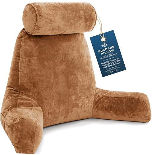 Husband Pillow XXL Tan Backrest with Arms - Adult Reading Pillow Shredded Memory Foam, Ultra-Comfy Removable Microplush Cover & Detachable Neck Roll, Unmatched Support for Bed Rest Sit Up Pillow