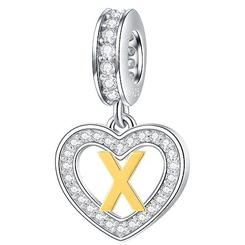 Letter X Charms Initial Necklace Pendant, 18K Gold Plated Letra x, 925 Sterling Silver Heart Alphabet Dangle Beads, fit Pandora Xmas Snake Chain, Gifts for Fathers Day/Mothers Day