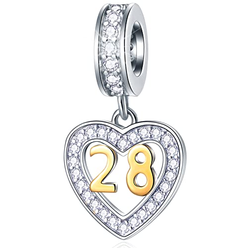 28 Years Old Birthday Charms fit Pandora Charm Bracelet, 18K Golden Number 28 Dangle, 925 Sterling Silver 28th Anniversary Heart Necklace Pendant with CZ, Gifts for Couple/Lover