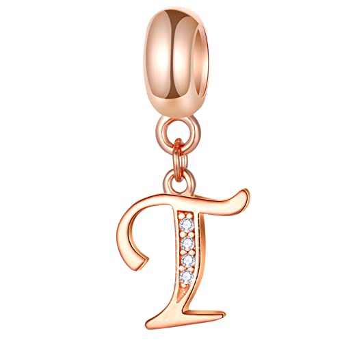 Rose Gold Letter T Charms, Initial T Alphabet Word Beads –Authentic 925 Sterling Silver Dangle CZ Birthstone, fits Pandora Charm Bracelets, for Twins/Teens/Thanksgiving Day Gifts