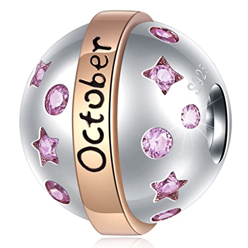 October Birthday Birthstone Planet Ball Charm-Fits Pandora Breast Cancer Bracelet, 925 Sterling Silver with Rose Gold Plated, Pink CZ Round Beads, Gifts for Daughter/Women/Aunt