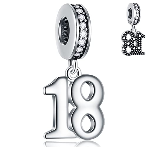 18 Years Birthday Dangle Charms fits Pandora DIY Necklace, 925 Sterling Silver 18th Anniversary Pendant Beads with CZ, Milestones Number 18 Bday Gifts for Cousin/Goddaughter