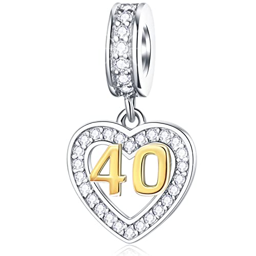 40th Anniversary Charms fit Pandora First Mothers Day Bracelet, Golden Number 40 Dangle, Sterling Silver 40th Birthday Heart Necklace Beads with CZ, Gifts for Mom/Ladies/Friends