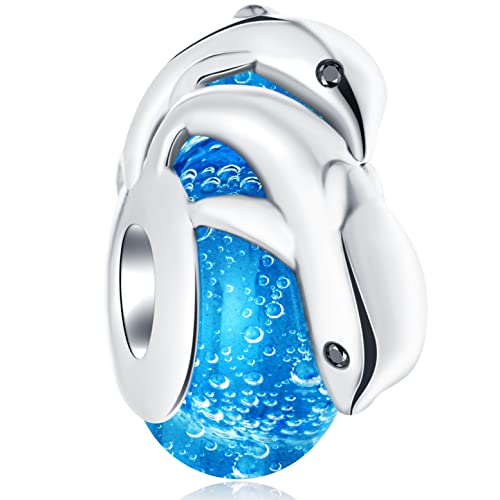 Mother/Child Dolphin Charms on Sea Blue Murano Glass Beads, fit Pandora Ocean Bracelet, 925 Sterling Silver Playful Mum/Baby Dolphins Charm, Gift for Daughter/First Mothers Day/Son