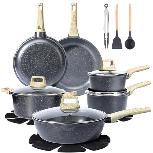 Kitchen Academy 17 Pcs Pots and Pans Set Non Stick, Induction Kitchen Cookware Set, Green Healthy Nonstick Granite Coated Saucepans Frying Pans Set, PFOA & PFOS Free