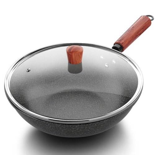 Wok - Nonstick Woks and Stir Fry Pans with Glass Lid Free Stone-Derived Coating Wooden Effect Handle Suitable for All Stove Induction by