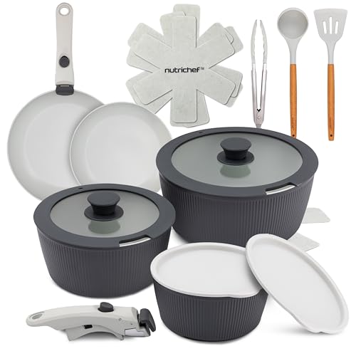 NutriChef 18-Piece Ceramic Cookware Set with Detachable Handles, Non Stick Pots and Pans, PTFE-Free Natural Ceramic Coating, Space-Saving Design, Oven & Stove Safe, Includes Utensils