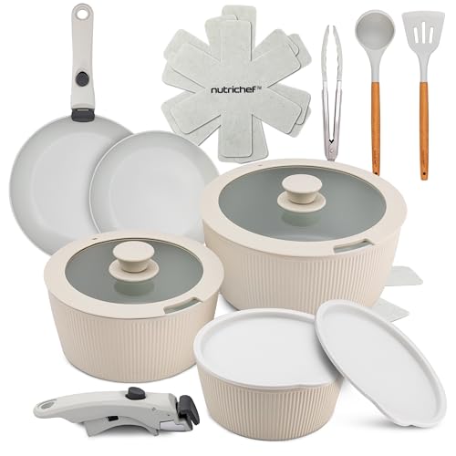 NutriChef 18-Piece Ceramic Cookware Set with Detachable Handles, Non Stick Pots and Pans, PTFE-Free Natural Ceramic Coating, Space-Saving Design, Oven & Stove Safe, Includes Utensils, Cream