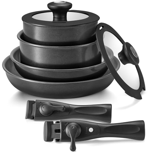 BEZIA Induction Hob Pans Set, Nonstick Pots and Pans Set 10 Pieces, Saucepan Sets with Detachable Handles, Stackable Cookware Set for All Hobs