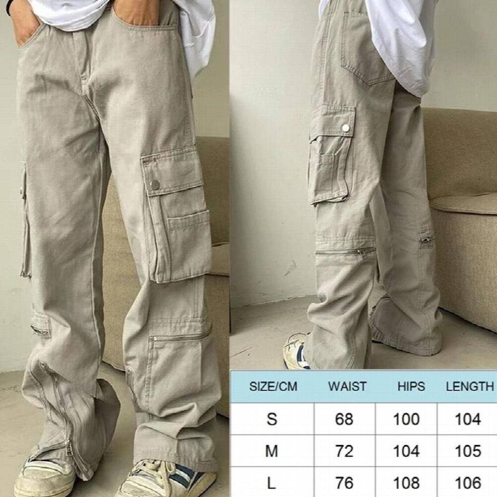 (White Beige-M) Vintage Cargo Pants Womens Low Waist Trousers 90S Streetwear Pockets Wide Leg Y2K Casual Straight Overalls