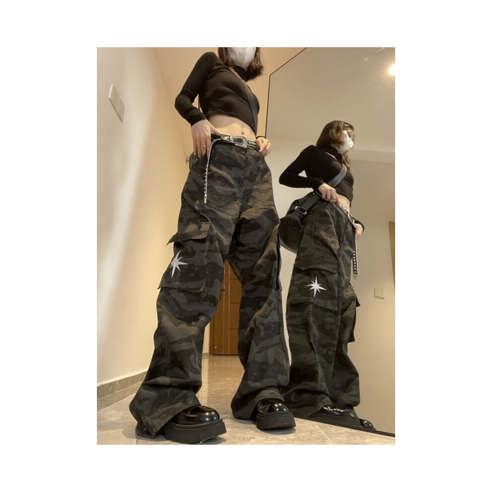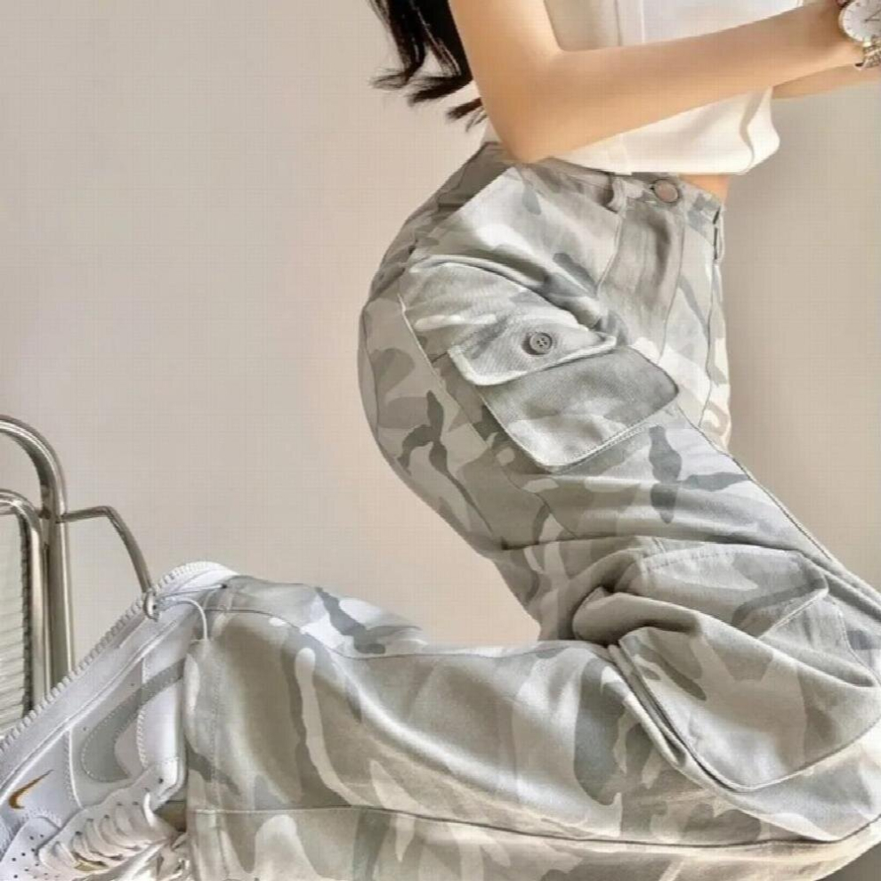 (1 Beige-L) Camouflage grey cargo pants women American vintage streetwear straight loose hiphop pants ins cargo pants womens