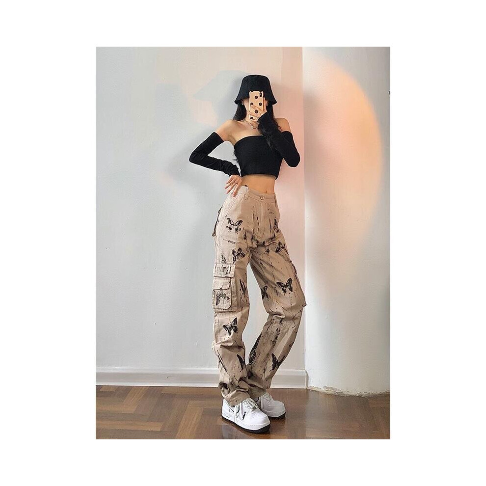 (1 Beige-M) Summer Cargo Pants Womens Ink Splatter Tie Dye Butterfly Y2k Women's Straight High Waist Pants Vintage Streetwear Women