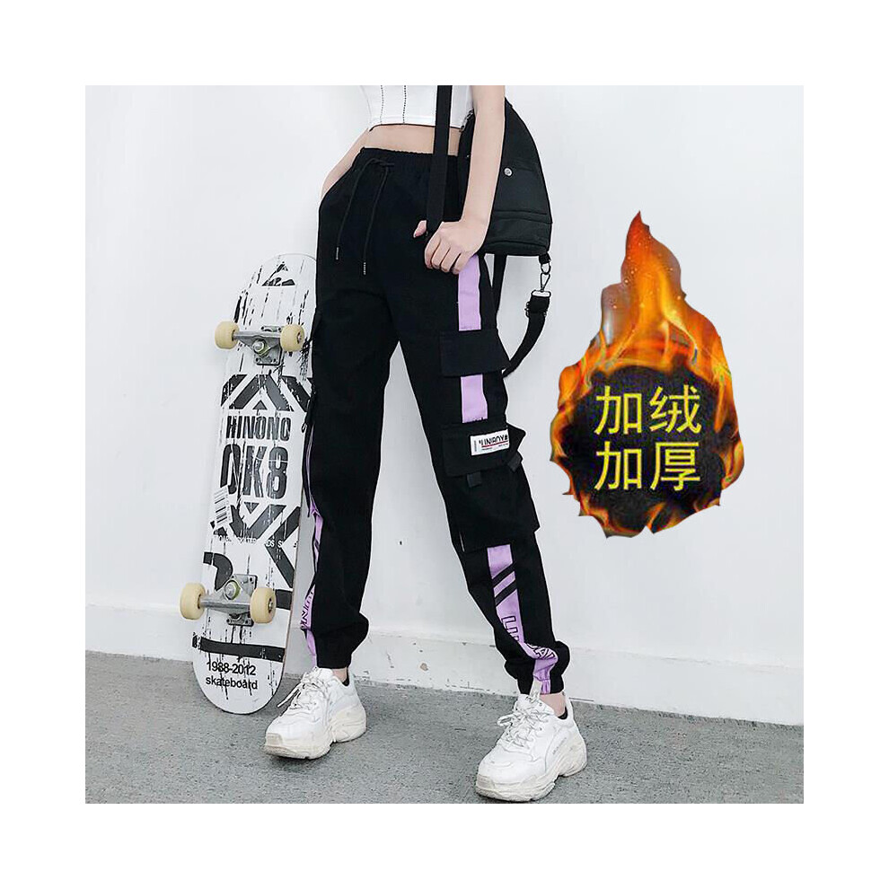(purple edge thicken Beige-5XL) Plus Velvet Thickened Cargo Pants Women's Autumn and Winter Loose Literary Solid Elastic Waist Warm Casual Sweatpants