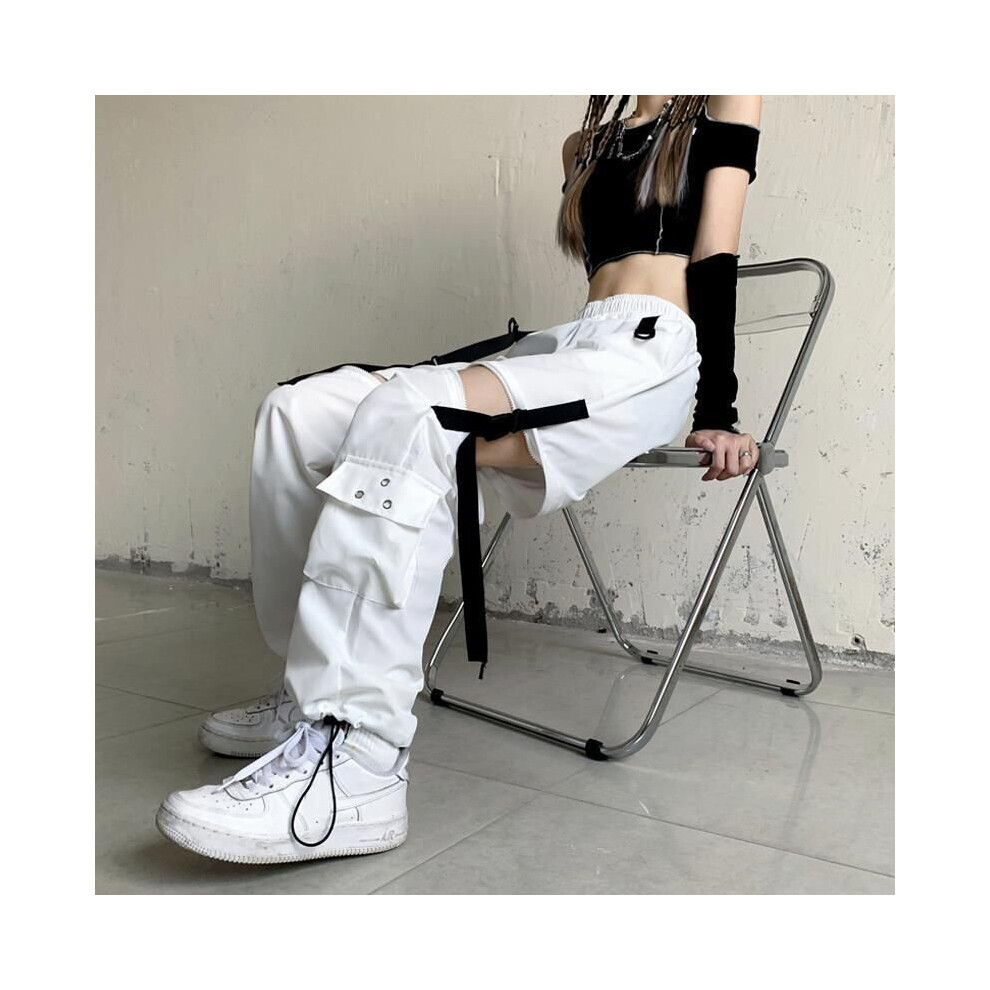 (white Beige-M) Detachable cargo pants women's loose tactical leggings men's waist casual straight pants unisex techwear trousers