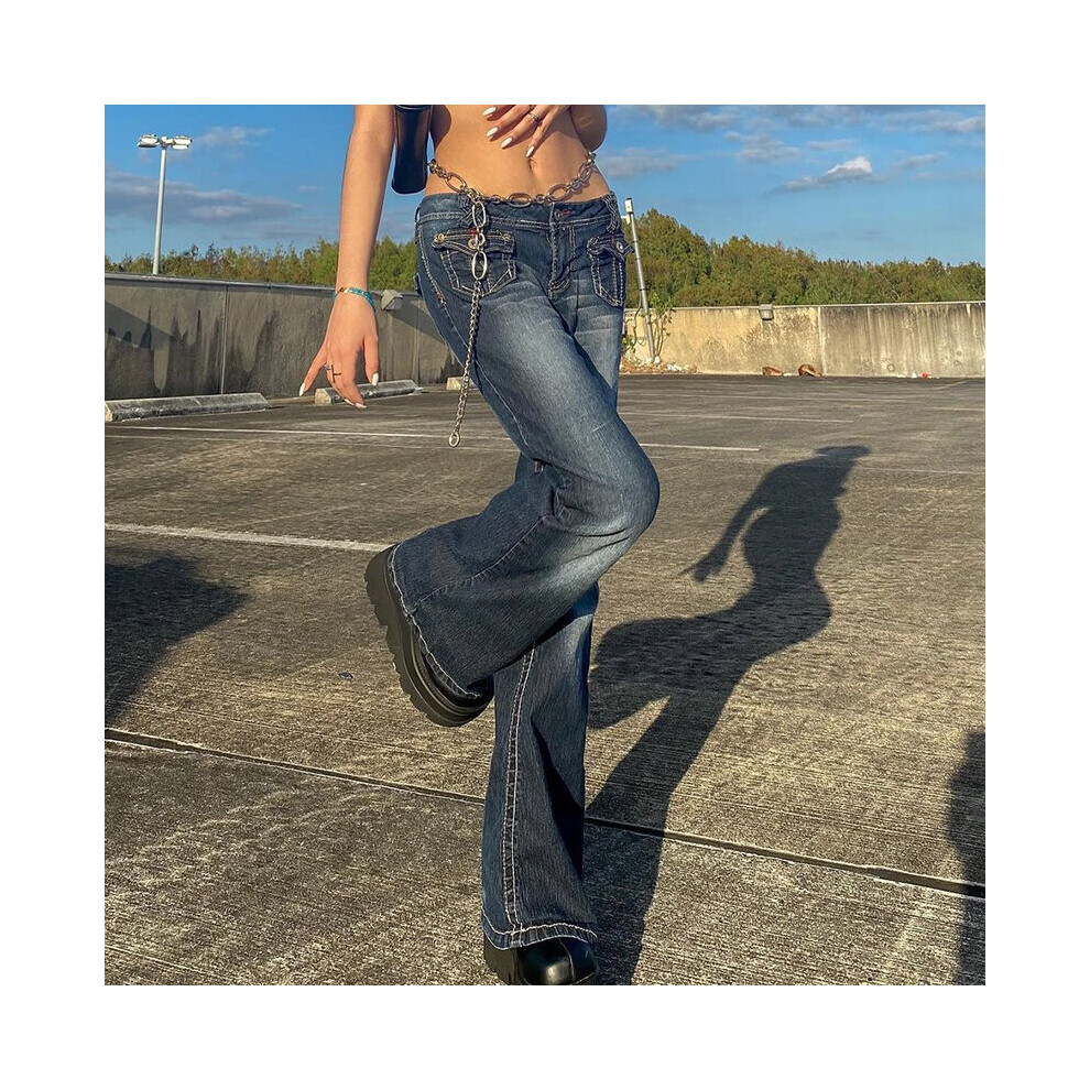 Women Denim Jeans Grunge Vintage Low Waisted Pockets Skinny Flare Pants 2000s Cargo Pants Women's Trousers Y2k