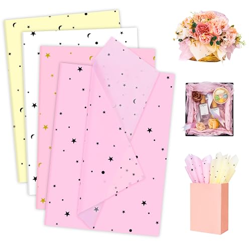 Larcenciel Tissue Paper 60 Sheets, Stars and Moon Tissue Paper for Wrapping Gift & Packaging, Light Pink Yellow White Gift Wrapping for Birthday Christmas Wedding Anniversary, 50x35cm
