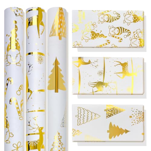 Niviy Christmas Wrapping Paper Roll x 3(300x43cm Each), Kids Wrapping Paper Printed with Xmas Pattern, Elves, Elk and Christmas Tree, Recyclable Xmas Wrap Paper for Wrapping Gifts