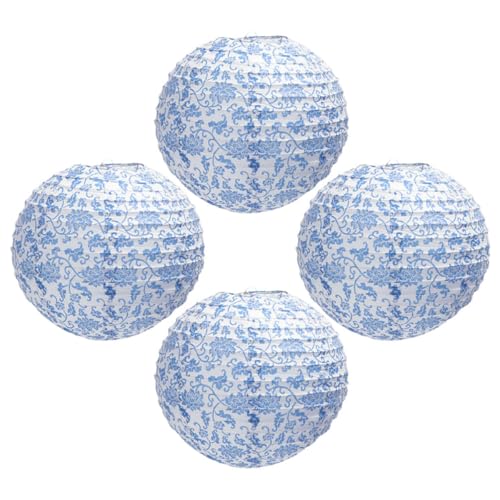 ELAYARD Lanterns Hanging Paper Lampshades 4Pcs Blue and White Porcelain 30Cm for Wedding and Classroom Ceiling Decoration Wire Frame
