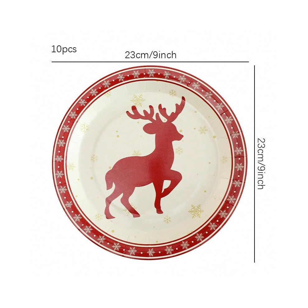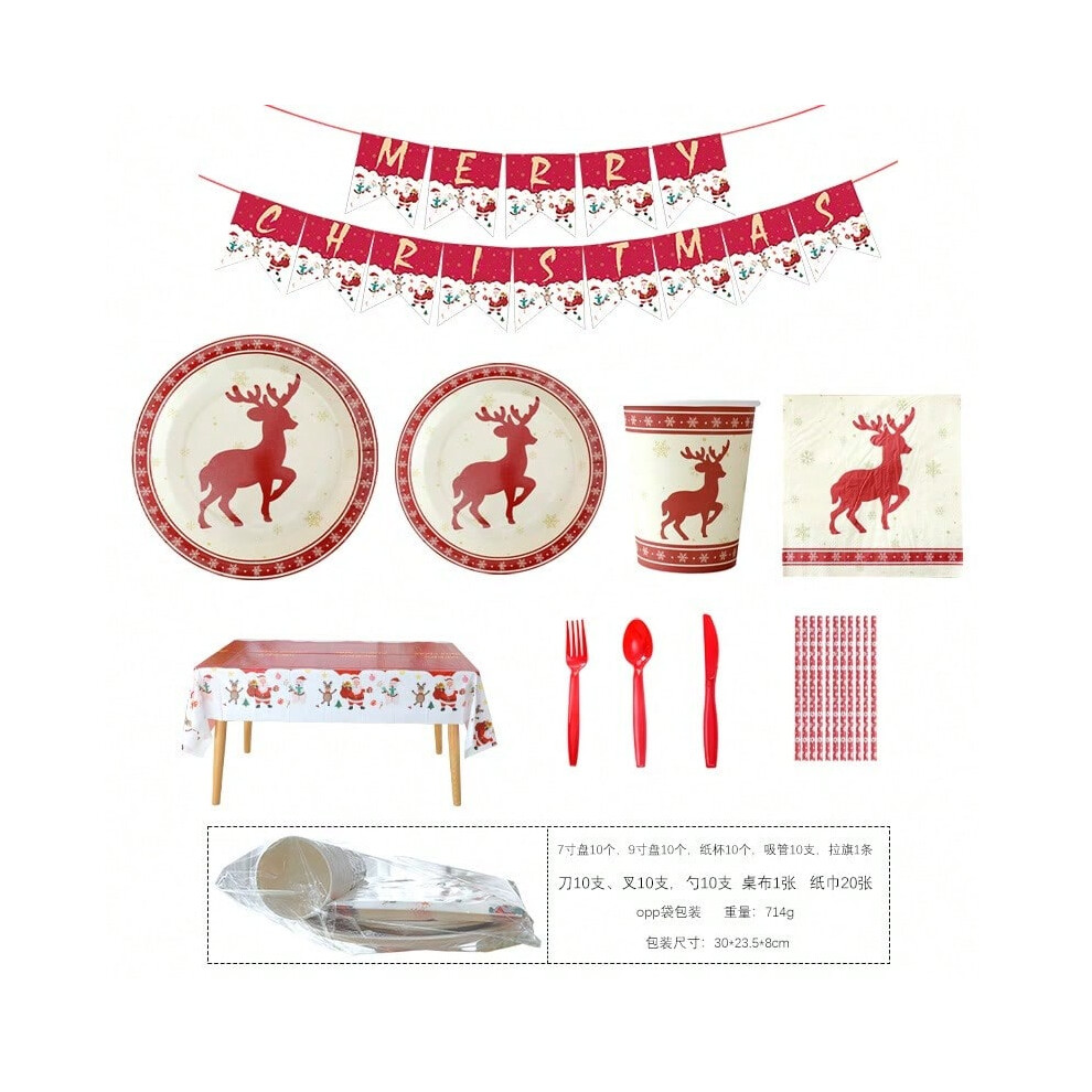 (10 red knives) Christmas Red Elk Paper Plate Paper Cup Paper Towel Disposable Dinner Plate Tablecloth Holiday Decoration Party Tableware Set