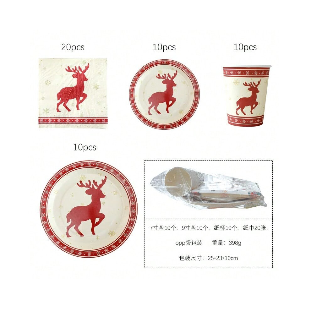 (Christmas Red Elk 4-Piece 50-Piece Set) Christmas Red Elk Paper Plate Paper Cup Paper Towel Disposable Dinner Plate Tablecloth Holiday Decoration Par