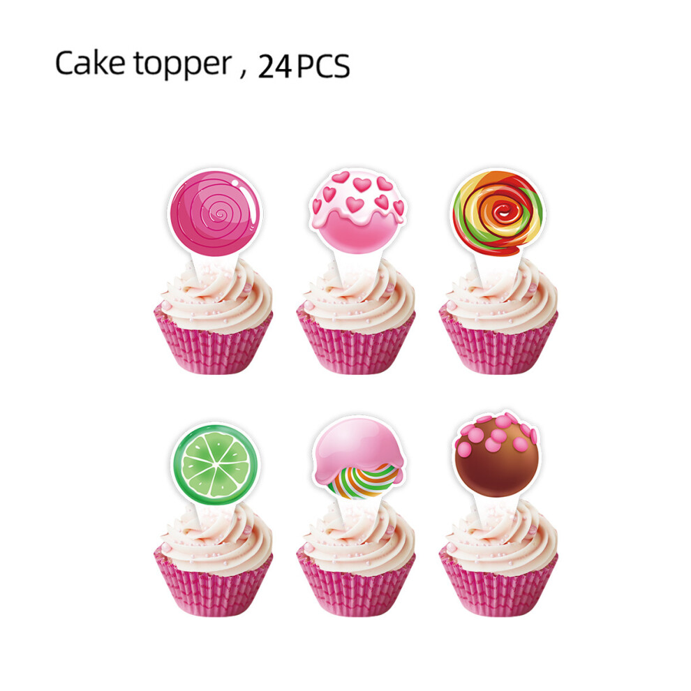 (24 pcs small socket strips) Lollipop pink girl birthday party decoration candy cake insert paper plate paper towel tablecloth tableware arrangement