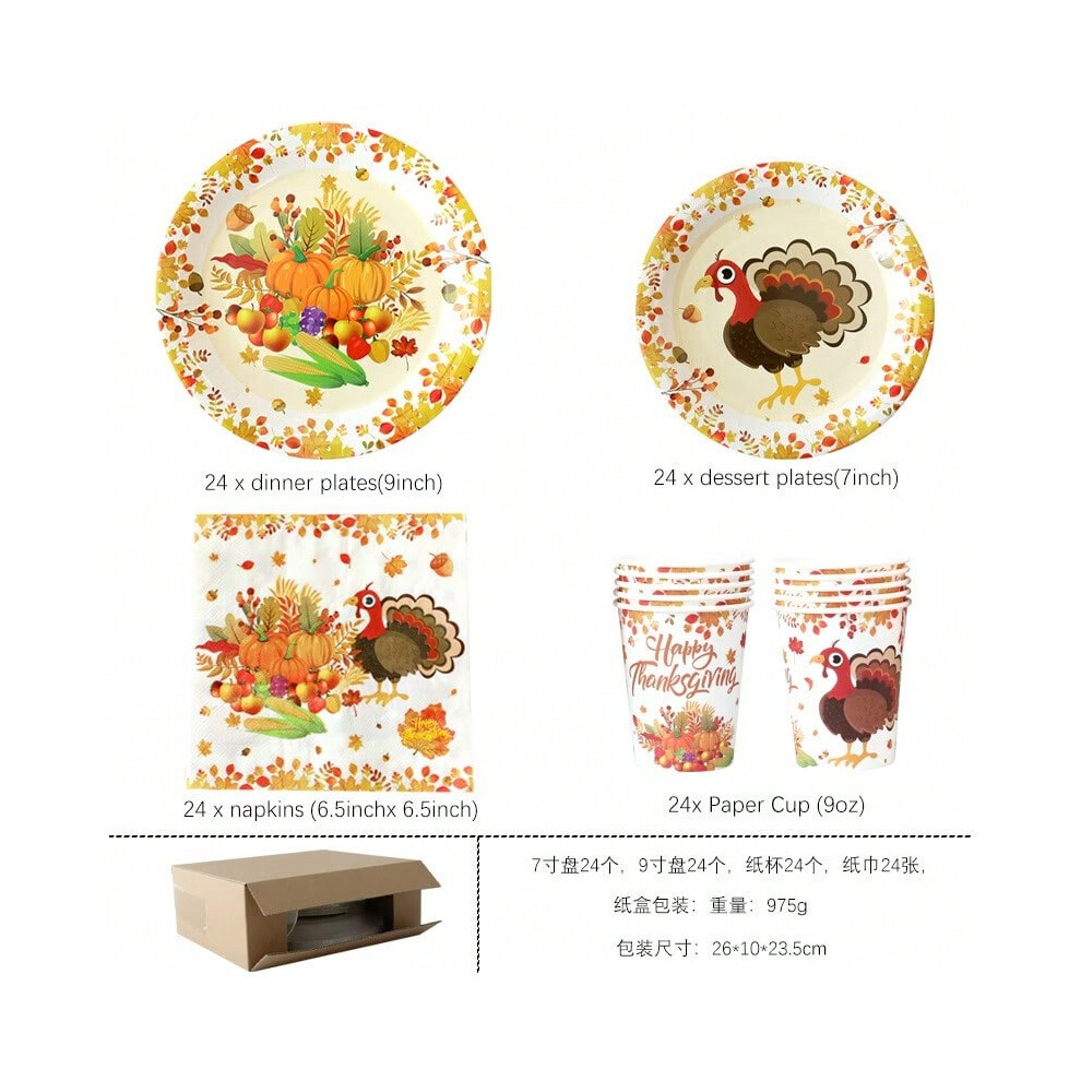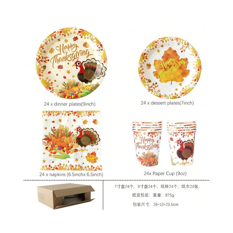 (Thanksgiving 96-piece set-1) Thanksgiving themed flag decoration disposable turkey pumpkin party tableware set maple leaf paper plate paper towel
