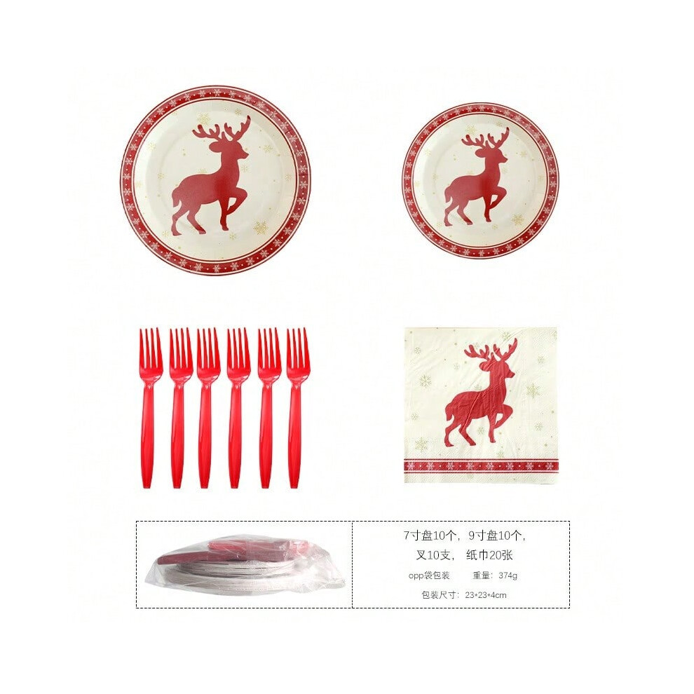(10 red forks) Christmas Red Elk Paper Plate Paper Cup Paper Towel Disposable Dinner Plate Tablecloth Holiday Decoration Party Tableware Set