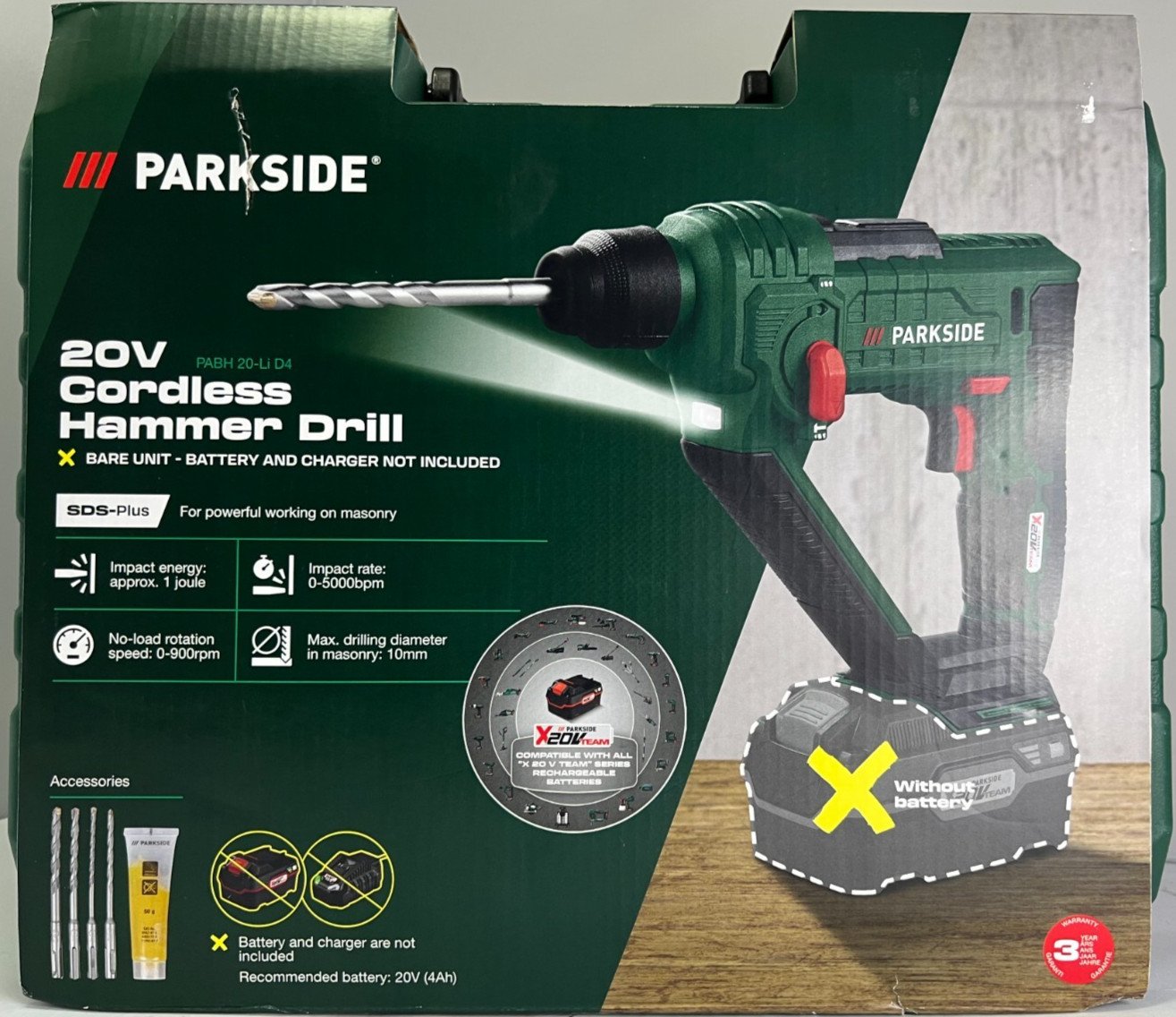 Parkside 20V Cordless SDS-Plus Hammer Drill Impact + 4 Drill Bits Case