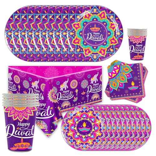 Happy Diwali Decorations Kit Include Happy Diwali Plates Cups Napkins for Festival of Lights Party Decorations Hindu Party Supplies(12 Guests)