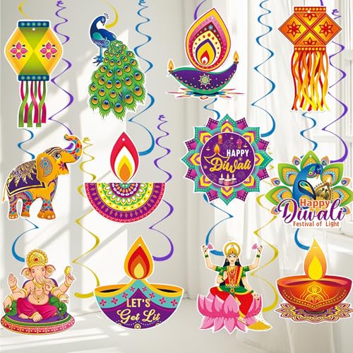 Xunerloy 24Pcs Diwali Hanging Decorations Diwali Banners Swirl Diyas Streamers Festival of Lights Party Supplies Indian Themed Party Decorations