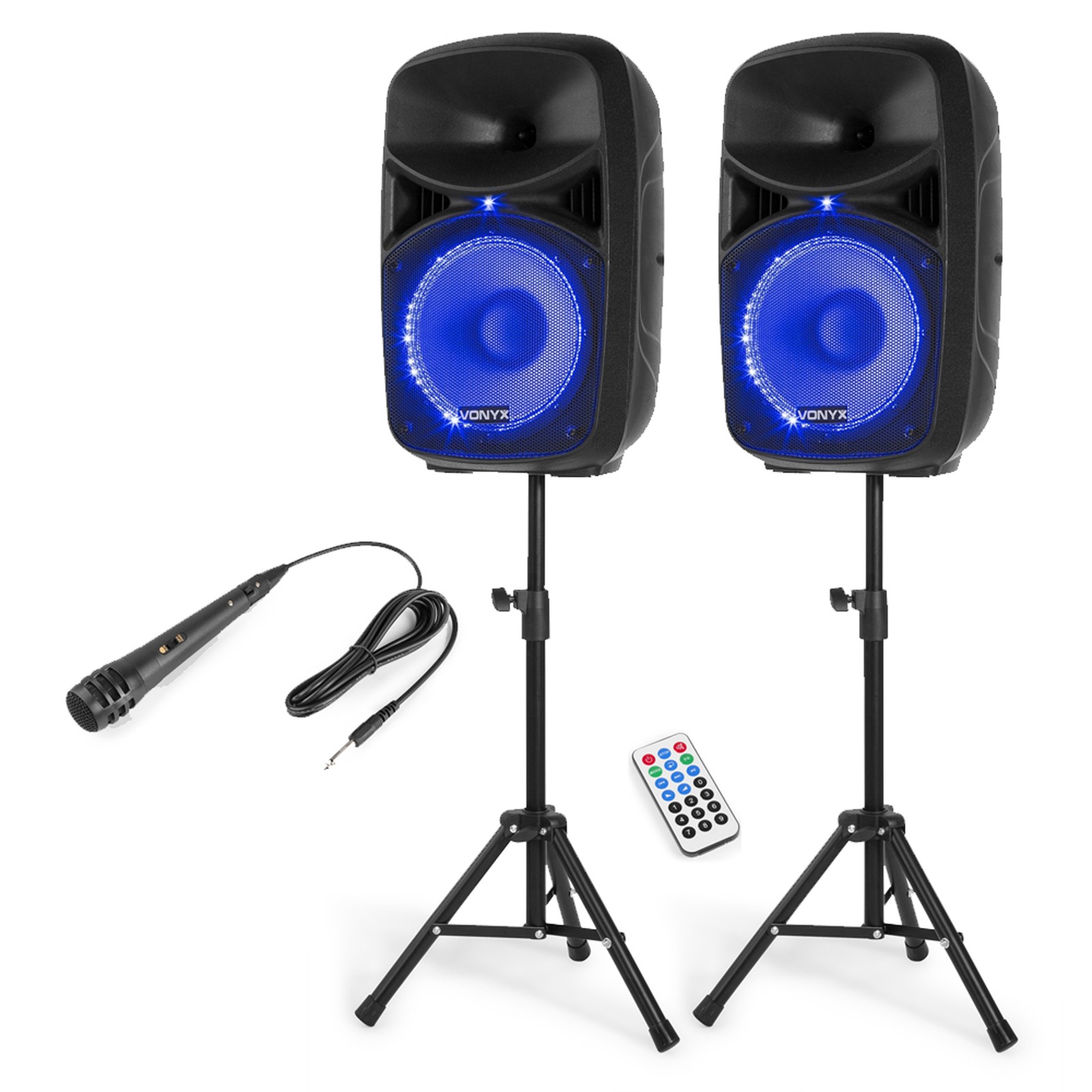Vonyx VPS152A 15-Inch Active Party Speaker System with Bluetooth, Speaker Stands, Wired Microphone & LED Lights – Complete DJ PA System for Karaoke, Events, Parties & Stage Performance