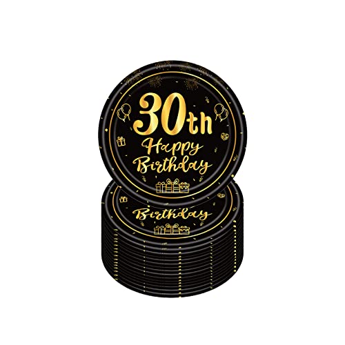 Happy 30th Birthday Paper Plates 7" Black and Gold - 16Pcs Disposable Tableware for Women, Men, Him, Her - Party Supplies and Table Decorations