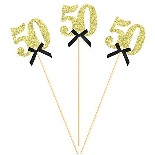 Sotpot 8pcs 50th Birthday Centerpiece Sticks Gold Glitter Number 50 with Bow Centerpieces Table Flower Topper for Man Woman 50th Birthday Anniversary Table Party Decorations