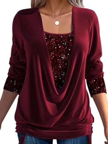 GAGFDA Sequin Loose Smocked Fake Two-Piece Top, Evening Tops Women Long Sleeve V Neck Solid Plus Size Loose Sequin T Shirt,for Party (Red,L)