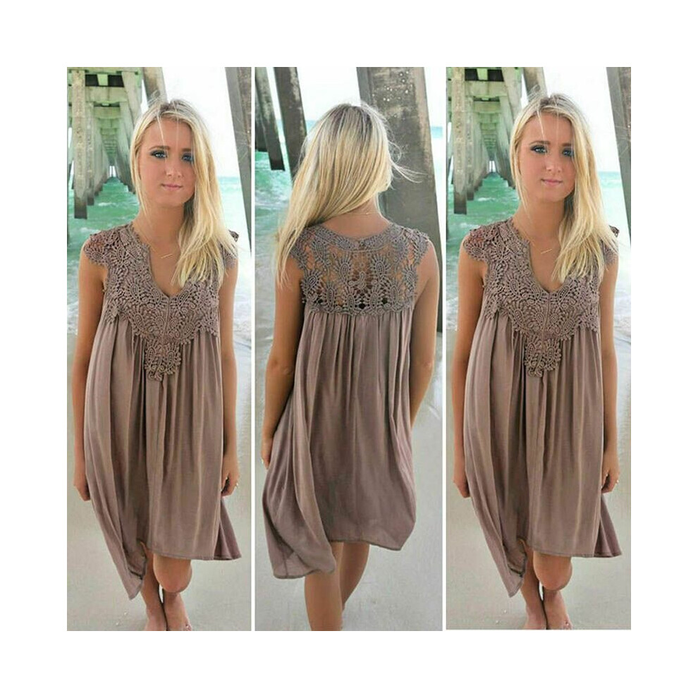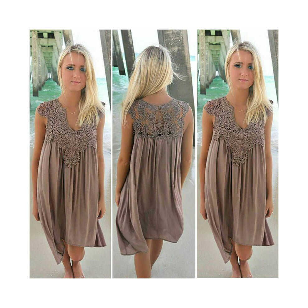 (Coffee, XL) Plus Size Lady Boho Sleeveless Party Tops Women Loose Summer Beach Lace Dress