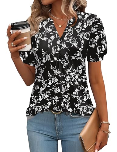 Rapbin Ladies Tops V-Neck Buttons Floral Print Short Sleeve Date Party Tops for Women UK Black White Flower-S(UK 8-10)