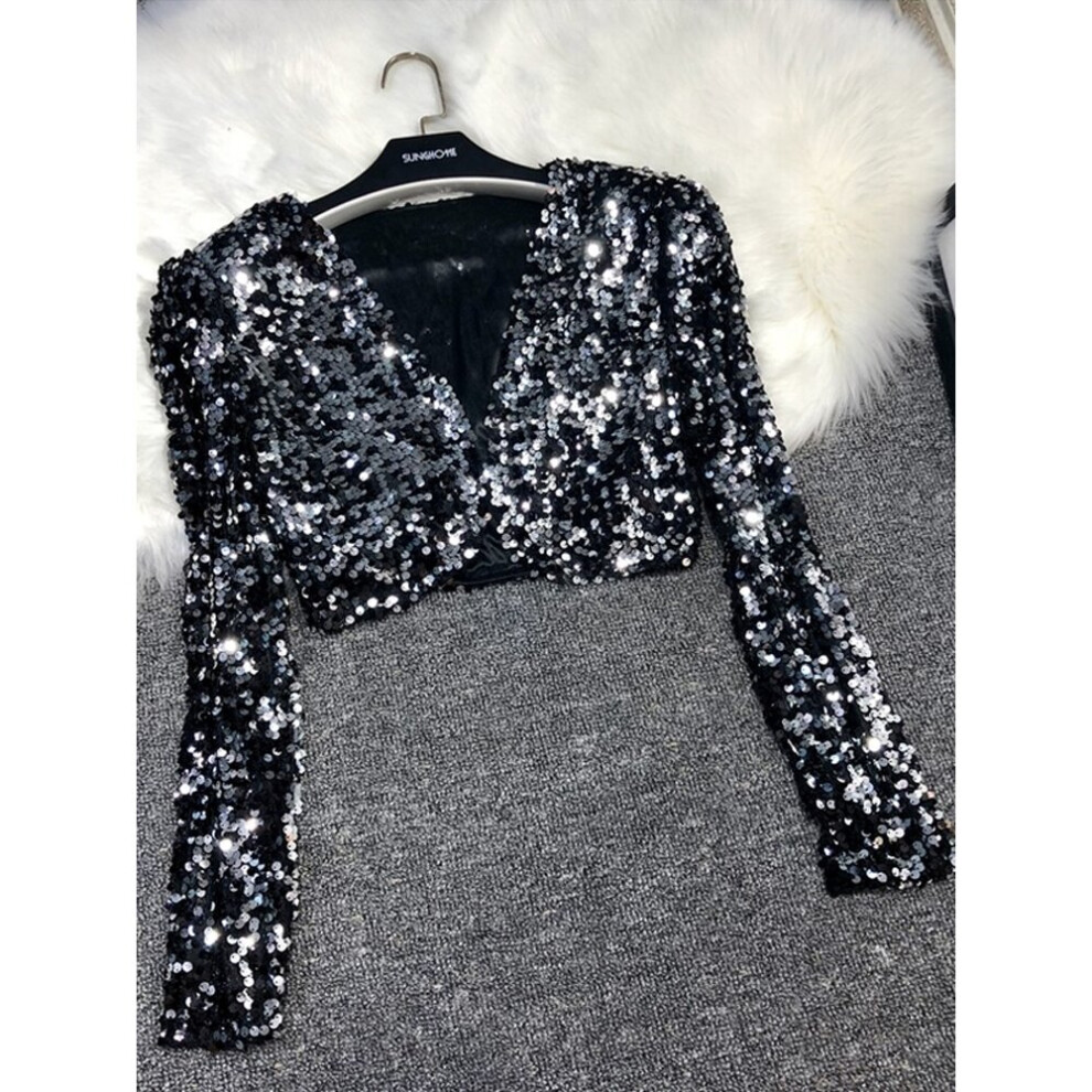 Tossy Sparkling Sequins Cropped Top Party Club Tops Women Street Tank Top Long Sleeve Jacket For Jazz Dance Performance