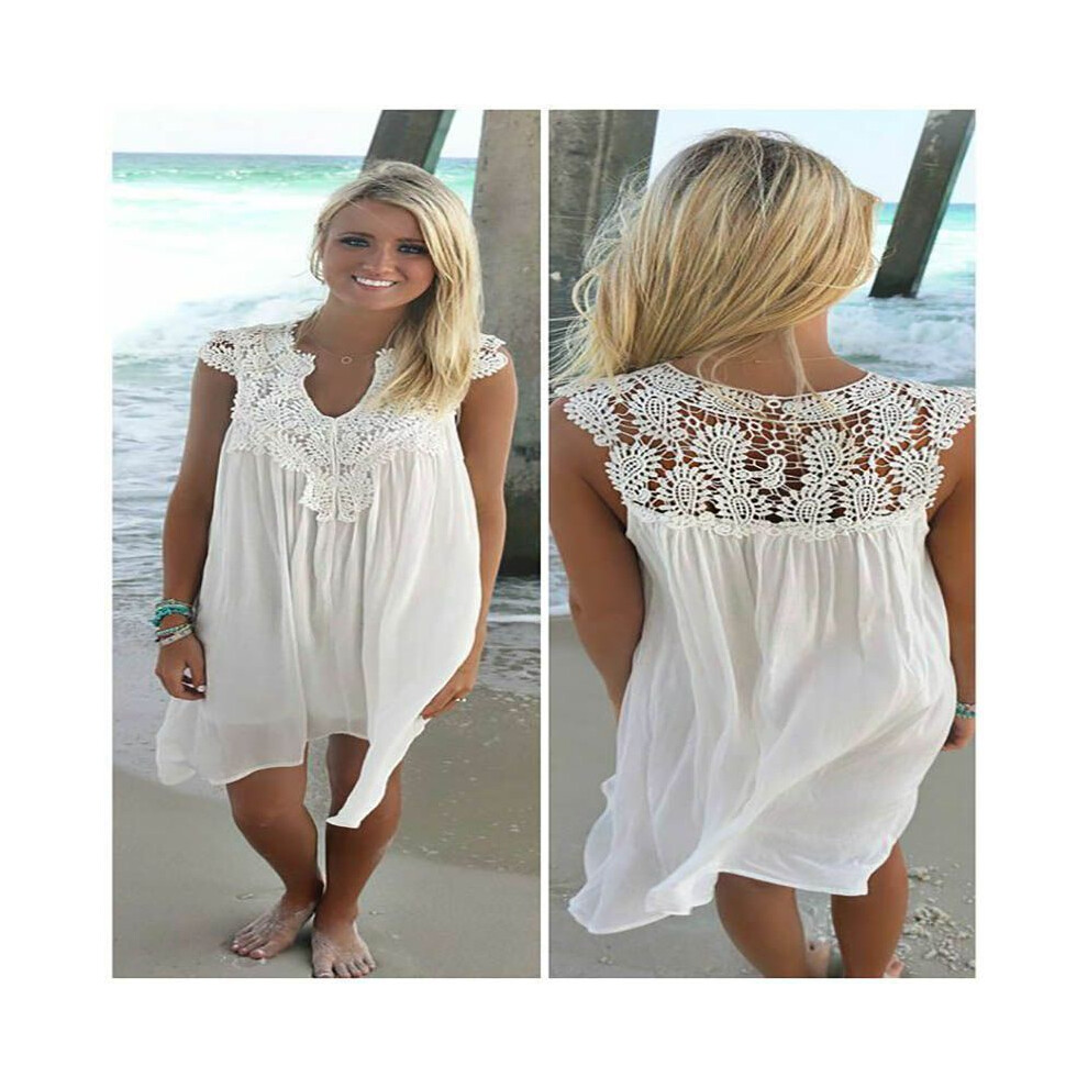 (White, S) Plus Lady Size Boho Sleeveless Party Tops Women Loose Summer Dress Beach Lace