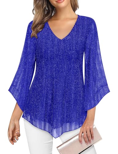 Gemulate Party Tops for Women UK Ladies Evening Tops Long Sleeve Chiffon Top Crew Neck Blouses Double Layered Mesh Shirts Sparkly Blue 3XL