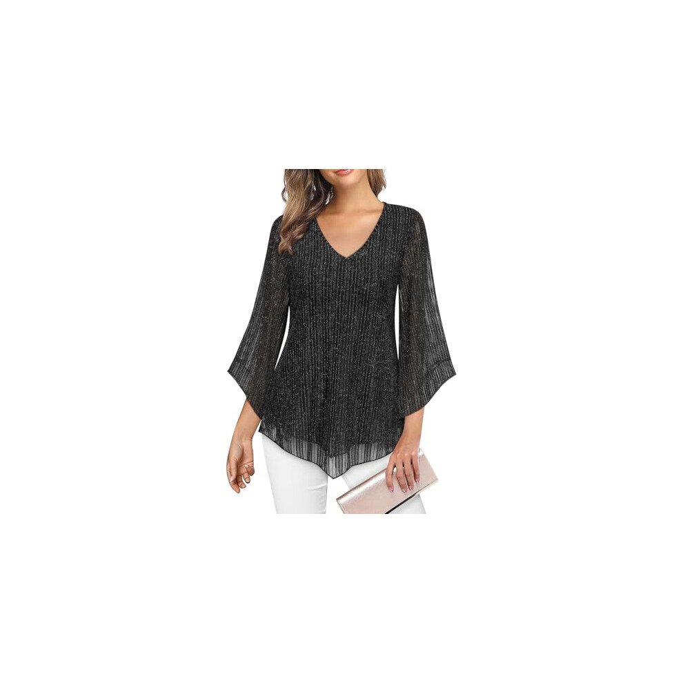 Gemulate Womens Blouses Ruffle 3/4 Sleeve Tunic Tops Loose Flowy V Neck Party Tops for Women UK Double Layers Mesh Shirts - Black Jacquard Weave, M