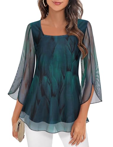 Syphiby Womens Blouses, Ruffle 3/4 Sleeve Tunic Tops Loose Flowy Square Neck Party Tops for Women UK Double Layers Mesh Shirts Green