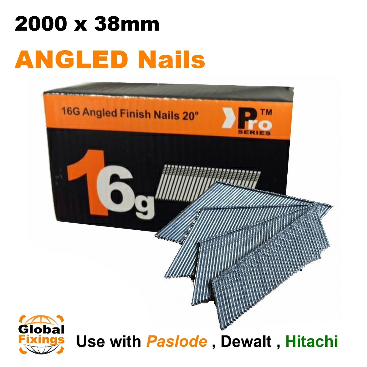 2000 pack- size 38mm, 16g ANGLED 20° - for Dewalt, Paslode, Hitachi Finish Nails