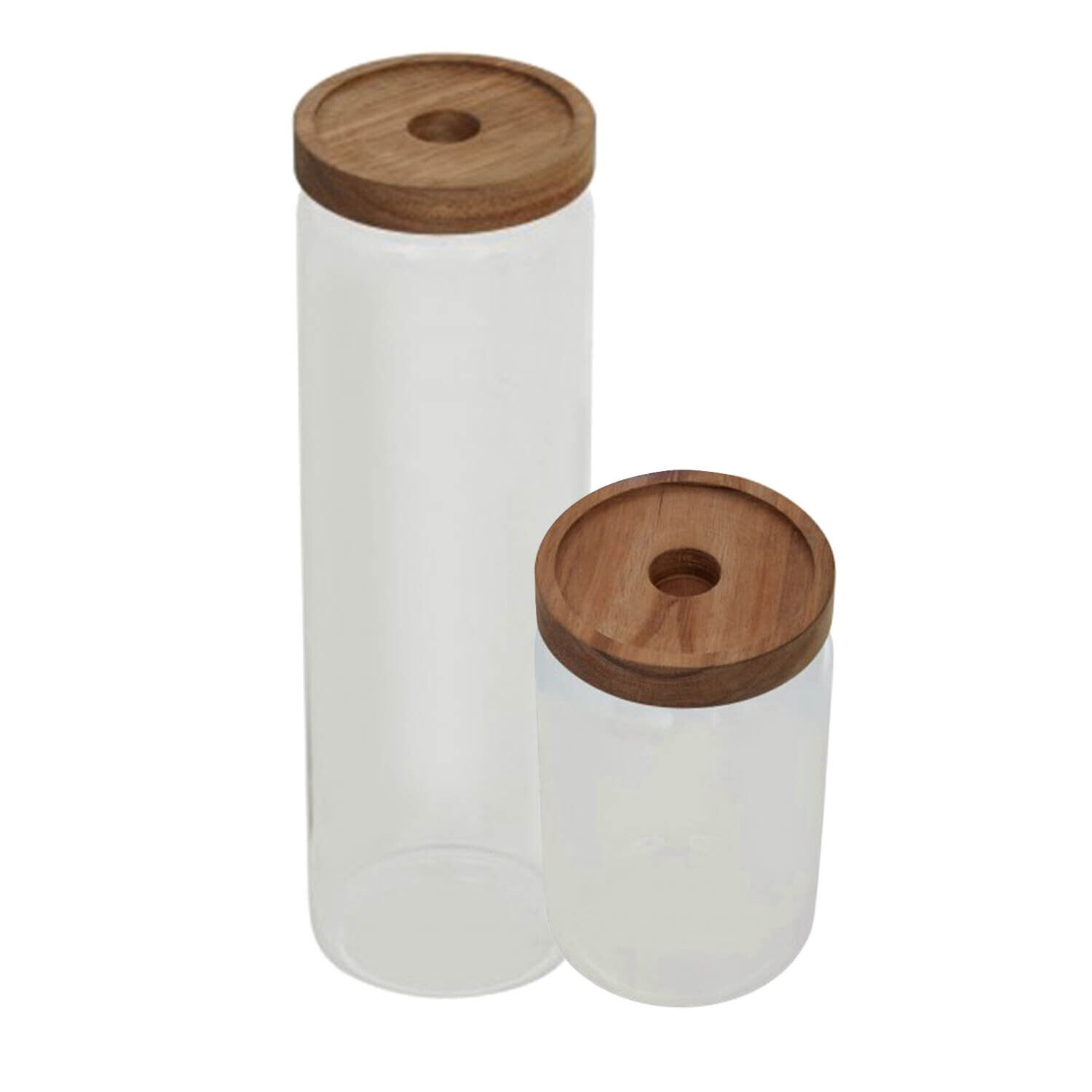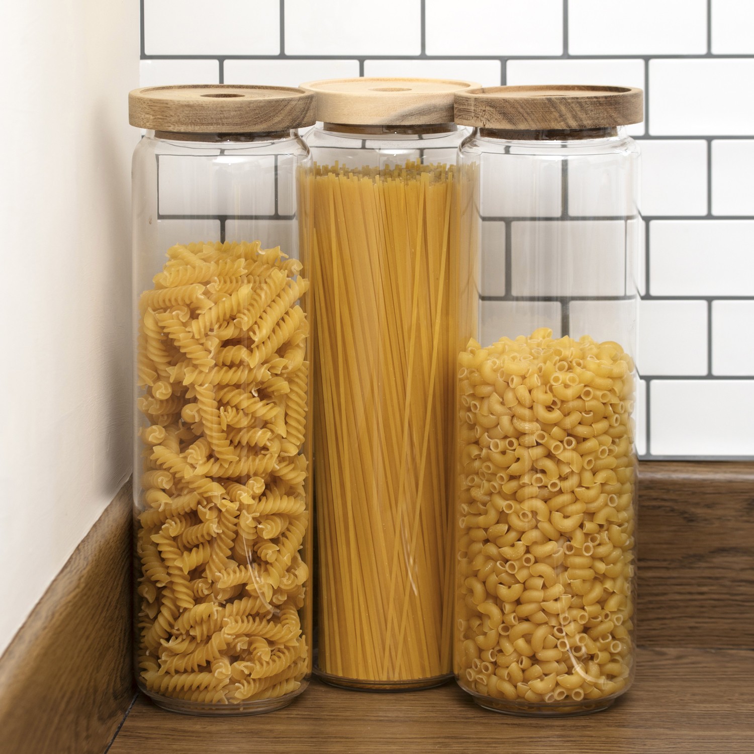 Set of 3 Acacia Lid Tall Glass Jars 1.5L Kitchen Cereal Rice Pasta Food Storage